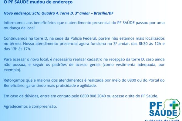 O atendimento presencial do PF Saúde passou por uma mudança de local em Brasília. Novo endereço:SCN, Quadra 4, Torre D, 3º andar – Brasília/DF O atendimento continua sendo... veja mais →