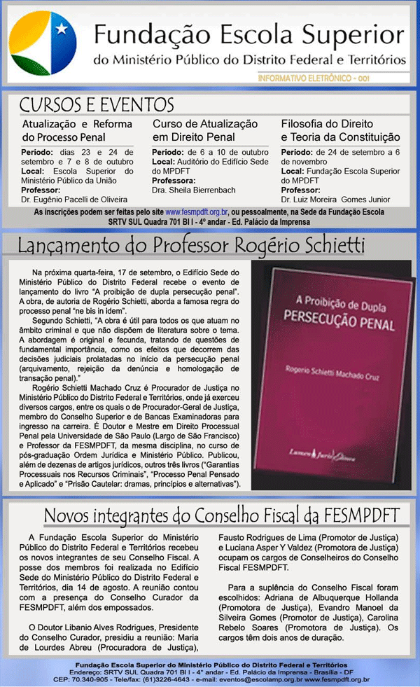 A FUNDAÇÃO ESCOLA SUPERIOR DO MINISTÉRIO PUBLICO DO DISTRITO FEDERAL E TERRITÓRIOS DIVULGA CALENDÁRIO DE CURSOS E EVENTOS PARA OS PRÓXIMOS MESES