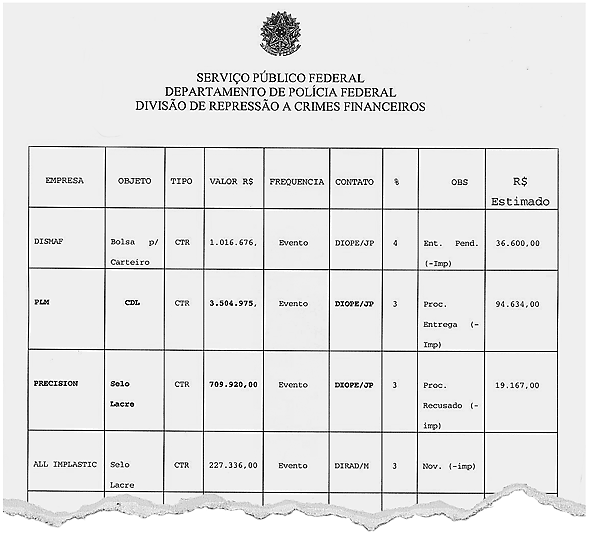 A Polícia Federal apreendeu nos computadores dos dirigentes dos Correios ligados ao PTB uma planilha em que estavam contabilizados os valores das propinas cobradas das empresas