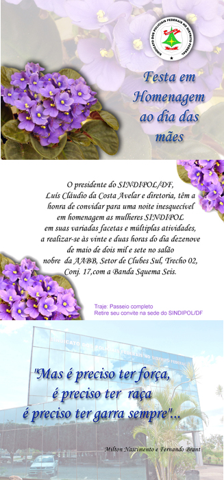 ATENÇÃO – os convites recebidos pelo correio não permitem o acesso ao baile. É necessário o comparecimento à sede do Sindipol/DF para a retirada do convite/ingresso que dá direito a entrada no baile.