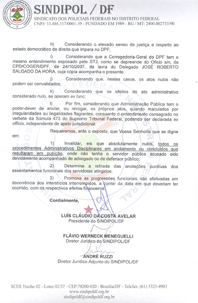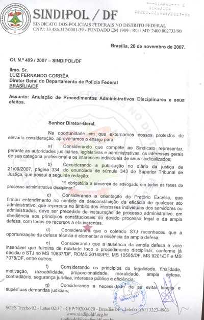 Em 20 de novembro de 2007 o Sindipol/DF enviou ofício à Direção Geral do DPF pedindo anulação de procedimentos administrativos disciplinares e seus efeitos.