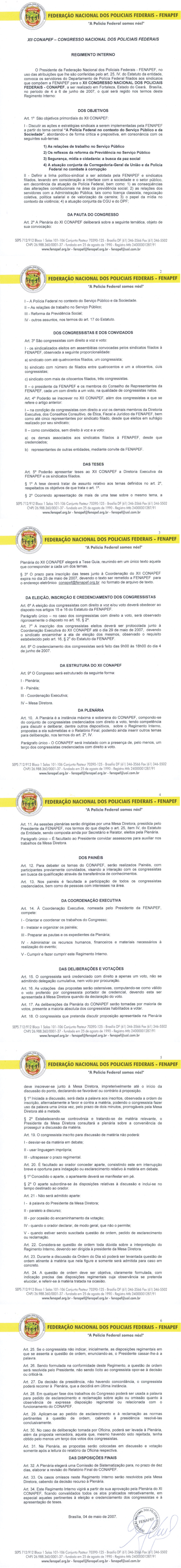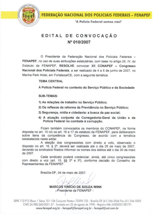 O Presidente do Sindicato dos Policiais Federais no Distrito Federal no uso de suas atribuições estatutárias convoca todos os sindicalizados em dia com suas obrigações para a Assembléia Geral Extraordinária aberta, que será realizada no dia 23 de maio de 2007, quarta-feira, de 09h00 as 17h00 para deliberarem sobre a.seguinte ordem do dia: