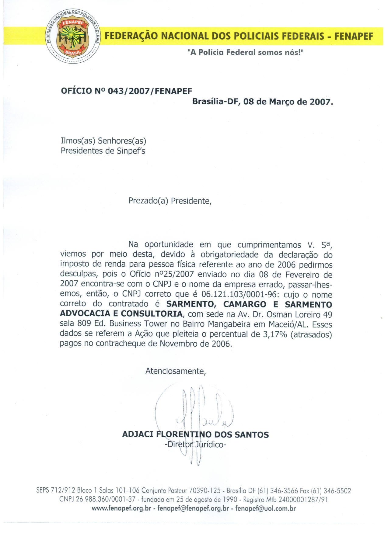 ERRATA – Fenapef envia novo documento com correção de dados do escritório de advocacia que atuou na Ação dos 3,17