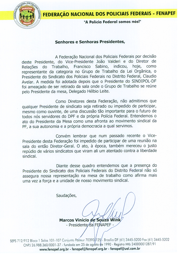 O presidente do Sindipol/DF Cláudio Avelar foi indicado, juntamente com o vice-presidente da Fenapef, João Valderi de Souza, a participar das reuniões do grupo de trabalho formado para elaborar a Lei Orgânica.