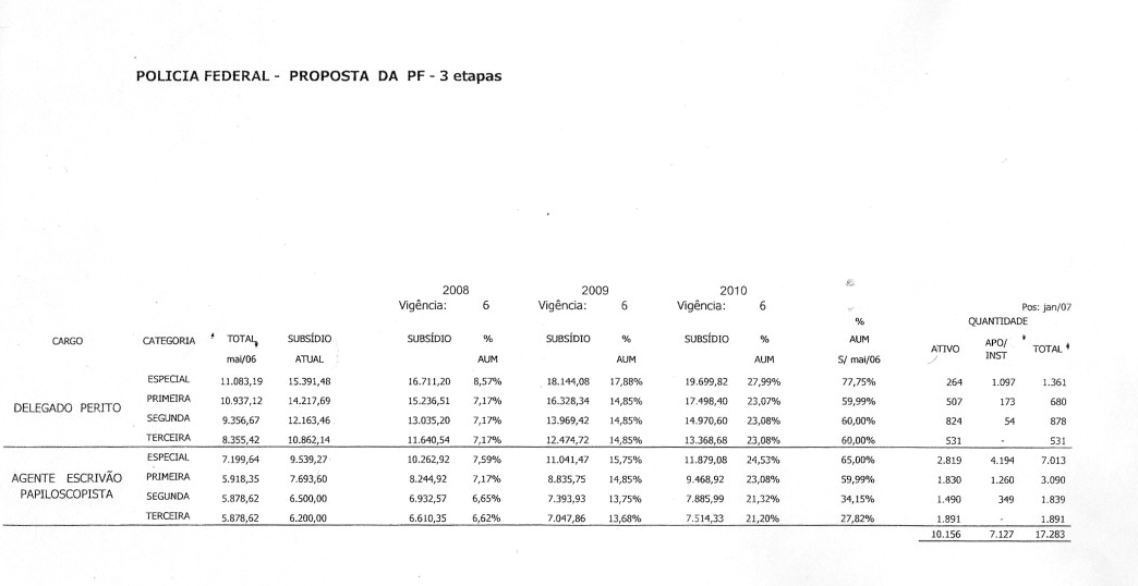 O que os representantes dos Policiais Federais não esperavam era que a tabela apresentada pelo secretário tivesse um percentual diferenciado, com um reajuste dividido em três parcelas, sendo a 1ª para 2008 com a finalização do reajuste prevista para 2010.