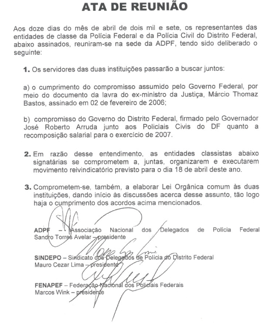 Ficou acertado que a paralisação do dia 18/04, dos Policiais Federais será de âmbito nacional e no DF os federais contarão com o apoio dos Policiais Civis que poderão compor o movimento reivindicatório, pois, as reivindicações de ambas as categorias são muito semelhantes.