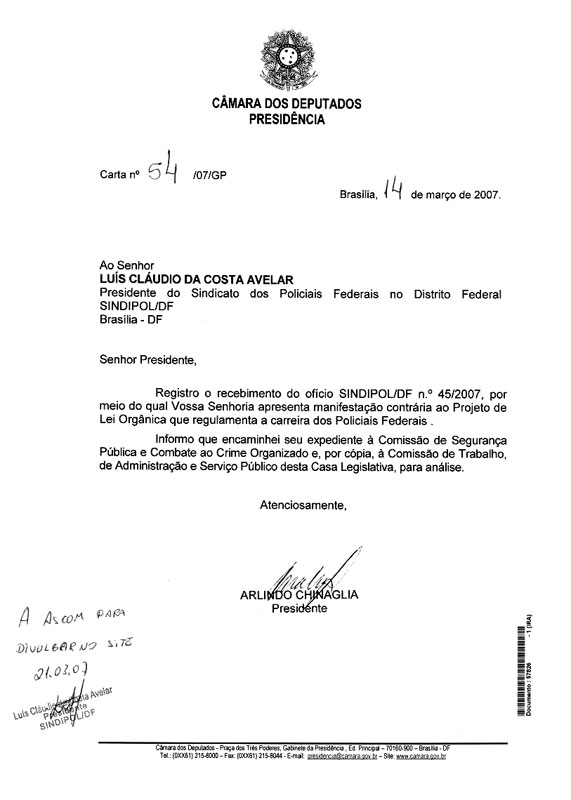 Presidente Sindipol/DF recebe documento do Presidente da Câmara, Arlindo Chinaglia, em resposta ao ofício de n° 45/2007, enviado pelo sindicato, que demonstra a insatisfação em relação ao Projeto de 21 de março de 2007 Notícias Leia Íntegra do documento: