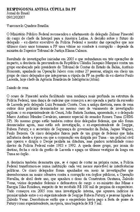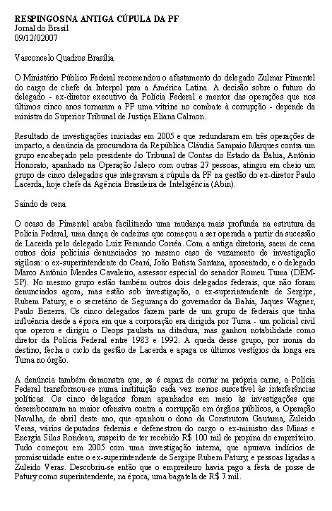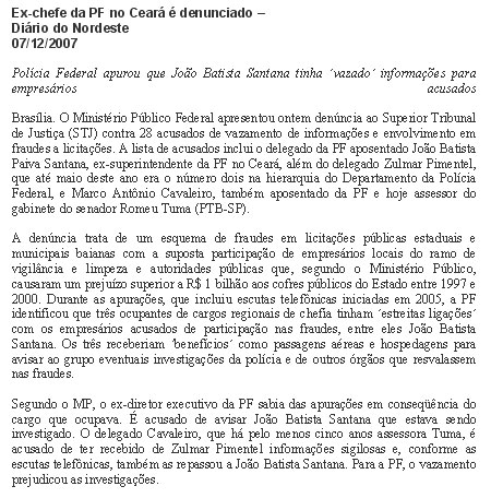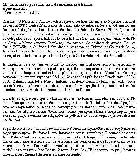 Na denúncia apresentada ontem, restrita às irregularidades praticados na Bahia, a subprocuradora-geral da República Cláudia Marques acusa o delegado Zulmar Pimentel, ex-número 2 da Polícia Federal, hoje na Interpol, de violação de sigilo.