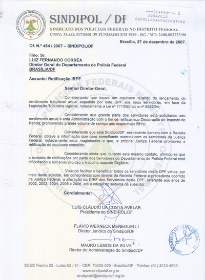 Assim, em dezembro de 2007, o Sindipol/DF encaminhou ofício ao DG solicitando a alteração da DIRF dos servidores do DPF, referente aos anos de 2002, 2003, 2004, 2005 e 2006. Posteriormente, a Coordenação de Recursos Humanos do departamento encaminhou ofício à Receita Federal, solicitando apuração da informação de suposto desconto indevido, porém até agora não houve resposta.