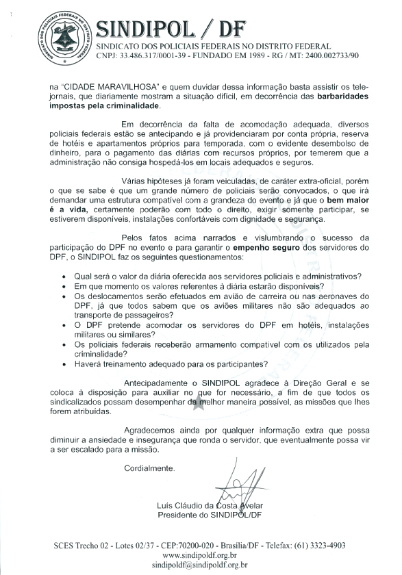 SINDIPOL/DF ENCAMINHA OFÍCIO AO DIRETOR GERAL SOLICITANDO INFORMAÇÕES SOBRE O DESLOCAMENTO E ESTRUTURA OFERECIDA AOS POLICIAIS FEDERAIS DESIGNADOS A PARTICIPAREM DAS DILIGÊNCIAS RELACIONADAS À REALIZ 8 de maio de 2007 Notícias Conheça o documento:
