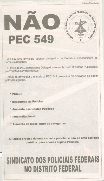 No intuito de sensibilizar a sociedade e os parlamentares sobre os danos que a PEC 549 causará se for aprovado, o Sindipol/DF publicou nos dias 17 e 18, anuncio no Jornal Correio Braziliense alertando a todos sobre os malefícios que essa PEC pode vir a trazer para o Estado e as instituições policiais.