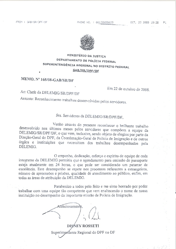 SUPERINTENDENTE REGIONAL DO DPF NO DISTRITO FEDERAL ELOGIA TRABALHO DOS SERVIDORES DA DELEMIG/SR/DPF/DF