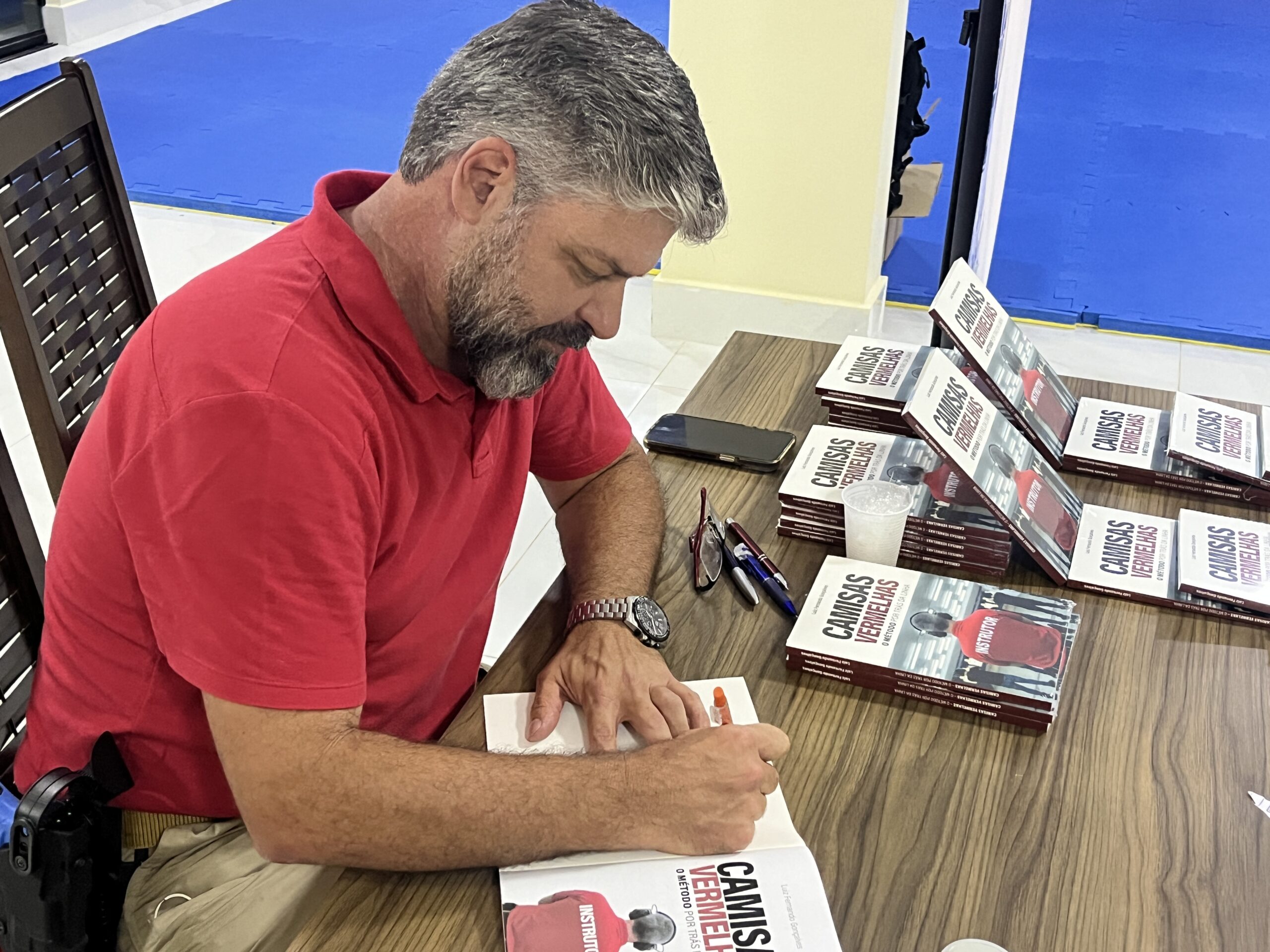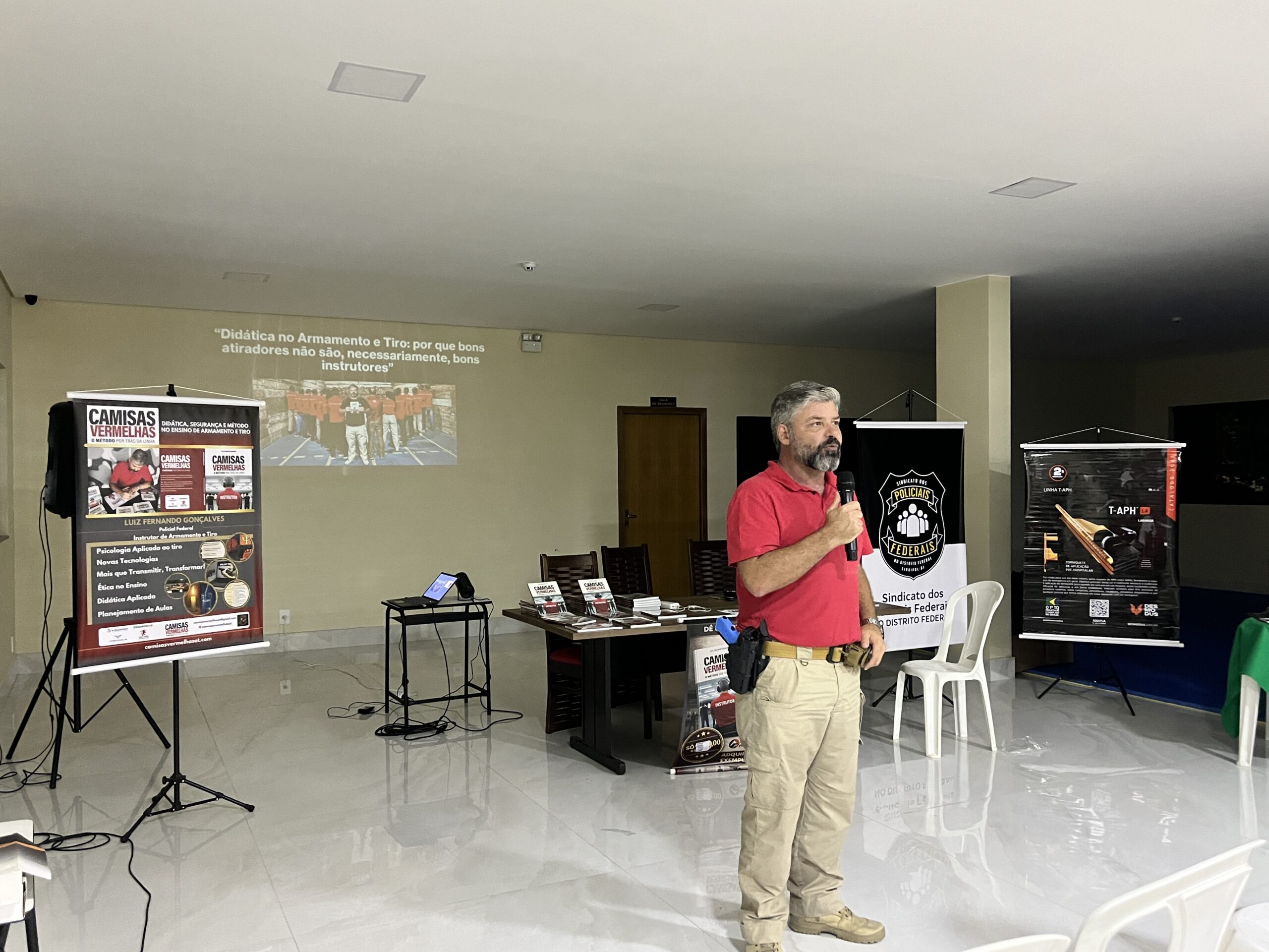 Na última terça-feira (24), o salão do estande de tiro do SINDIPOL/DF foi palco do lançamento do livro “Camisas Vermelhas: o método por trás da linha”, de autoria do sindicalizado Luiz Fernando Gonçalves, agente da Polícia Federal e instrutor de Armamento e Tiro.